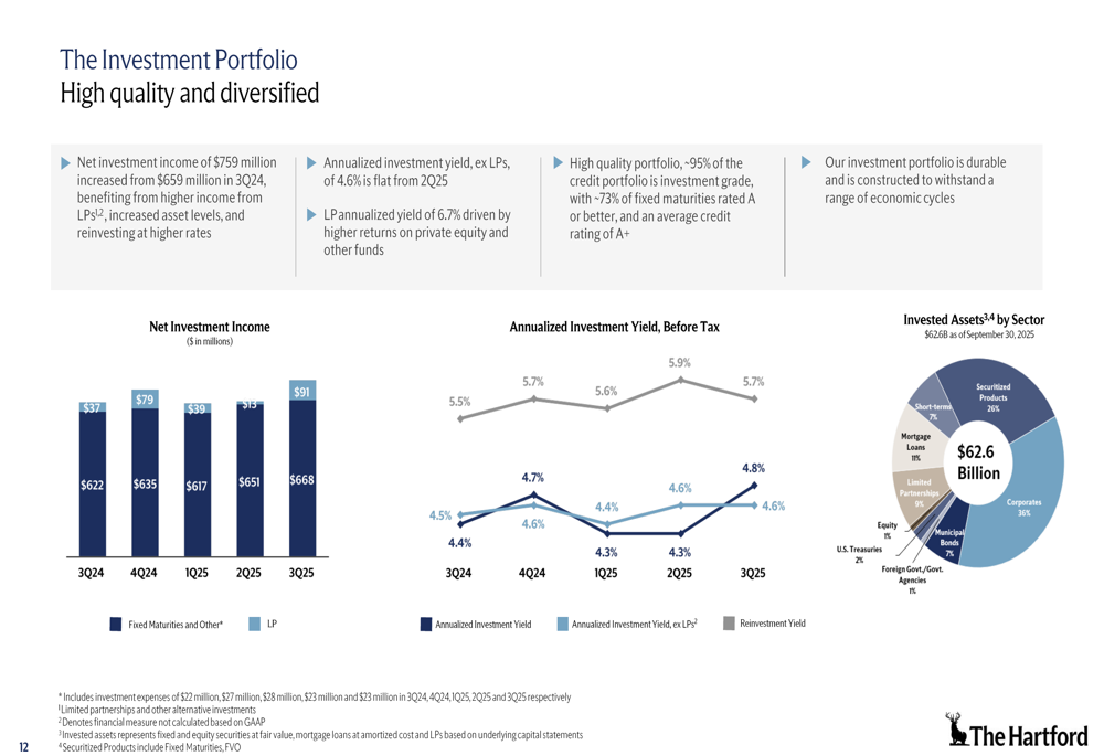 Net investment income rose to $759 million, up from $659 million in Q3 2024, benefiting primarily from greater income from limited partnerships, increased asset levels, and reinvestment at higher rates. The annualized investment yield, excluding limited partnerships, held steady at 4.6% quarter-over-quarter.