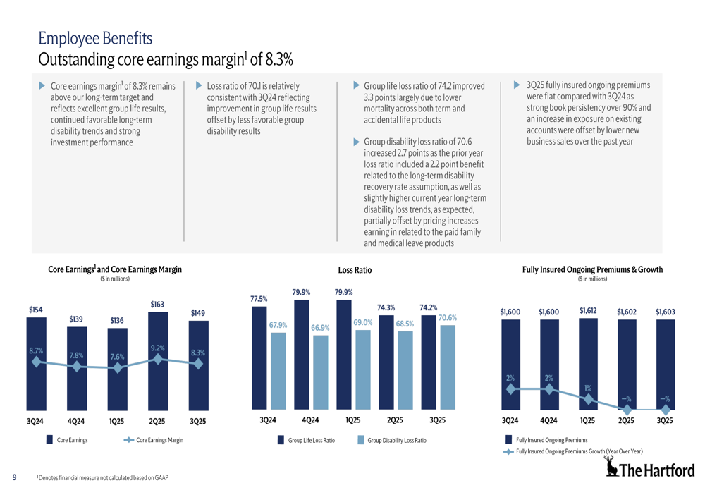 The Employee Benefits segment reported core earnings of $149 million, slightly down 3% from $154 million in Q3 2024, but maintained a strong core earnings margin of 8.3%. This performance reflects excellent group life results, favorable long-term disability trends, and strong investment performance.