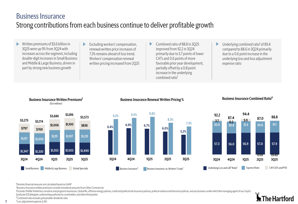 The Business Insurance segment, which contributes 55% of The Hartford’s revenue, delivered particularly strong results with written premiums of $3.6 billion, up 9% year-over-year. The segment’s combined ratio improved to 88.8% from 92.2% in Q3 2024, while maintaining disciplined pricing with renewal written price increases of 7.3% (excluding workers’ compensation), which the company noted remains ahead of loss trends.