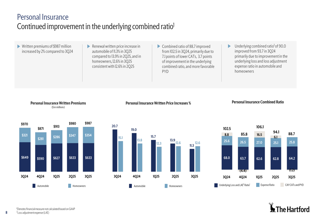 The underlying combined ratio improved to 90.0 from 93.7 in the prior year, demonstrating the effectiveness of The Hartford’s pricing and underwriting actions in this previously challenged segment.