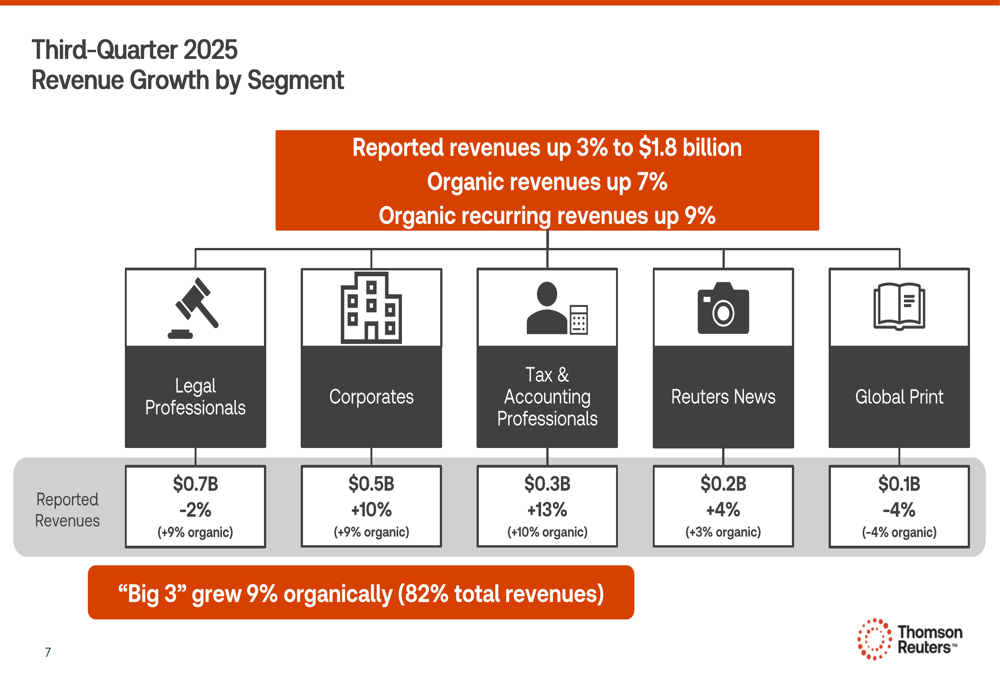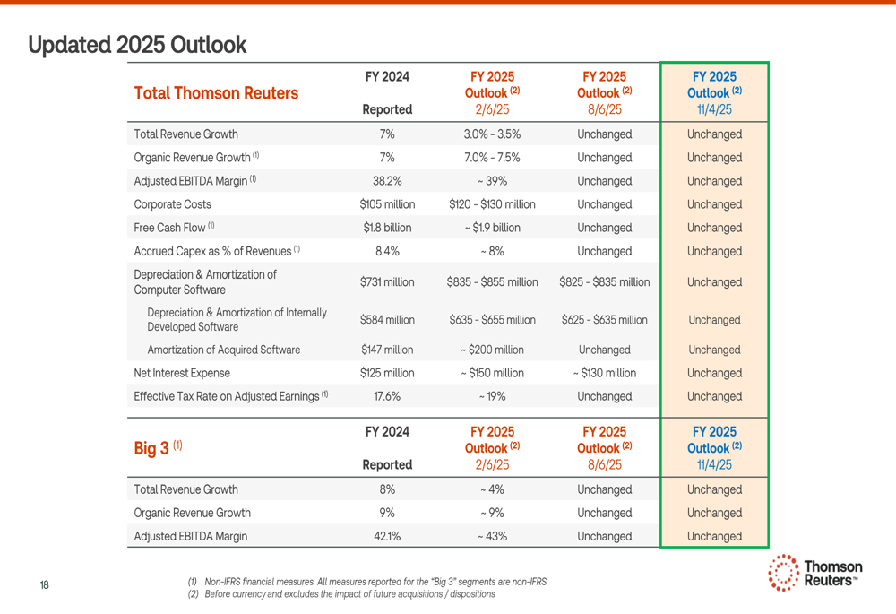 Thomson Reuters reaffirmed its full-year 2025 outlook while noting that total and organic revenue are trending toward the lower end of the previously provided ranges of 3.0-3.5% and 7.0-7.5%, respectively. The "Big 3" segments are still expected to deliver approximately 9% organic growth for the year.