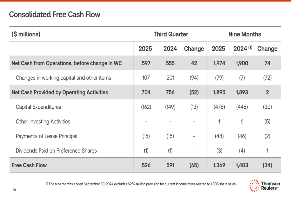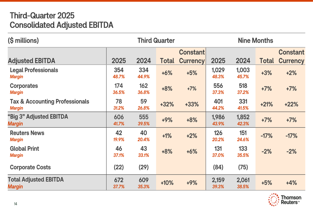 On the profitability front, all major segments showed margin improvements. The Legal Professionals segment achieved a 48.7% adjusted EBITDA margin, up from 44.9% in Q3 2024. Tax & Accounting Professionals saw the most significant margin expansion, increasing to 31.2% from 26.8% in the prior year.