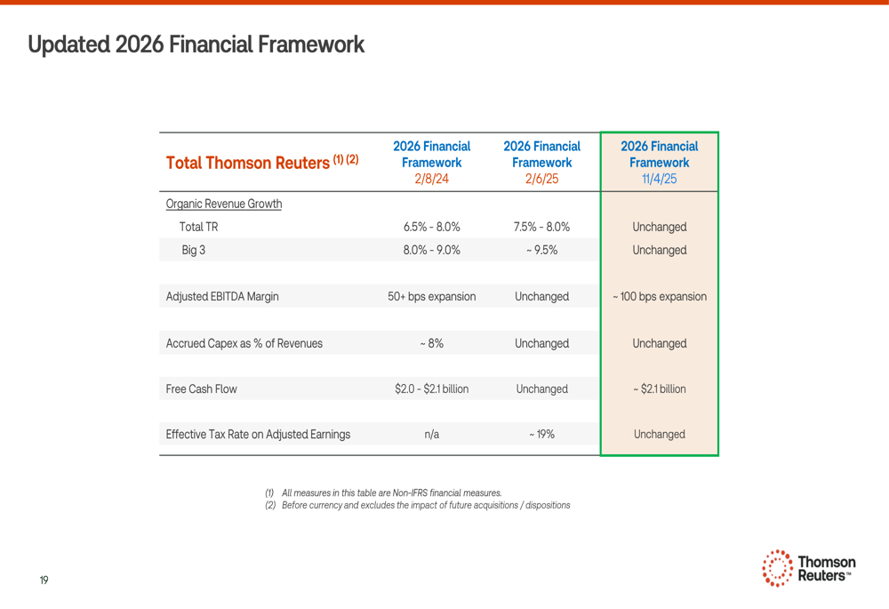 More notably, Thomson Reuters upgraded its 2026 financial framework, increasing its adjusted EBITDA margin expansion target to approximately 100 basis points, up from the previous target of 50+ basis points. The company also narrowed its free cash flow projection to approximately $2.1 billion, from the prior range of $2.0-$2.1 billion.