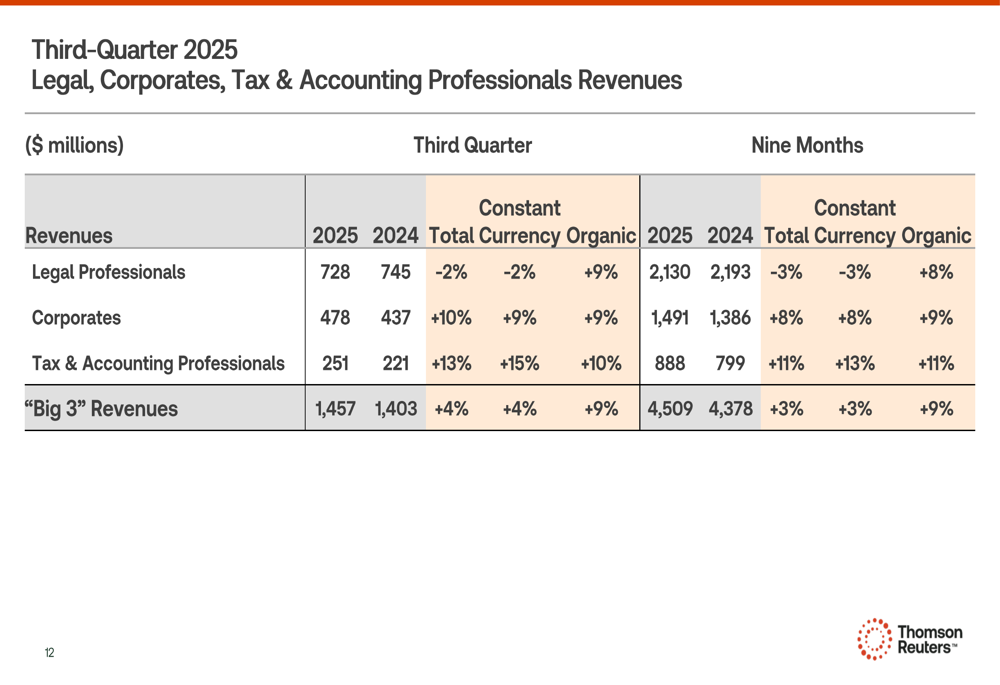 The "Big 3" segments—Legal Professionals, Corporates, and Tax & Accounting Professionals—which represent 82% of total revenues, collectively delivered 9% organic growth. The breakdown of revenue by segment shows varied performance: