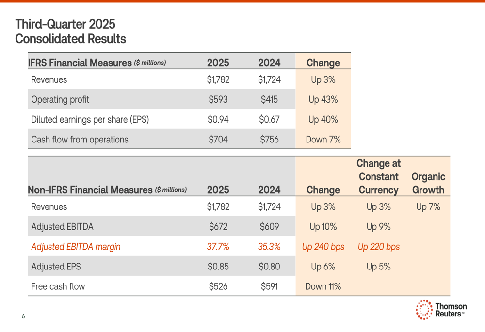 Thomson Reuters reported 7% organic revenue growth in the third quarter of 2025, driven by 9% recurring revenue growth. The company’s adjusted EBITDA increased 10% to $672 million, with margins expanding by 240 basis points to 37.7% compared to 35.3% in the same period last year.