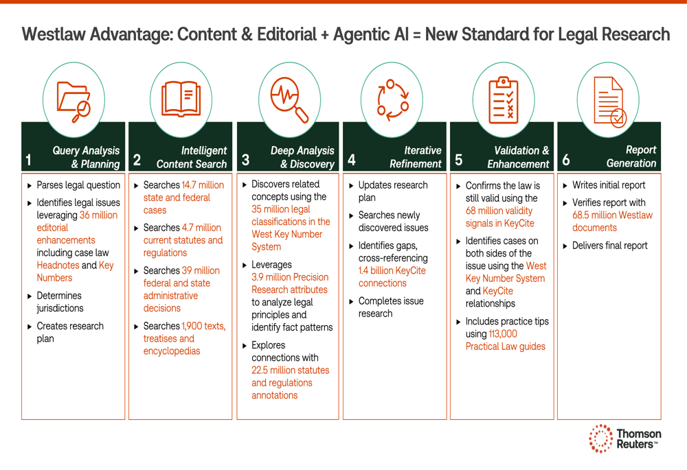 Building on this content foundation, Thomson Reuters is integrating advanced AI capabilities to create what it calls the "new standard for legal research." The company’s approach combines its extensive content and editorial expertise with agentic AI to enhance user workflows: