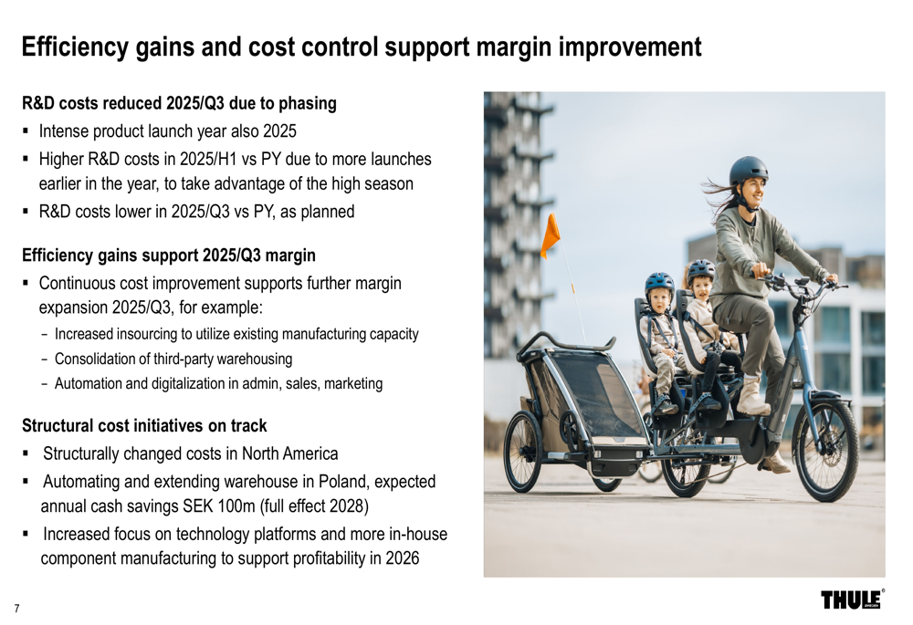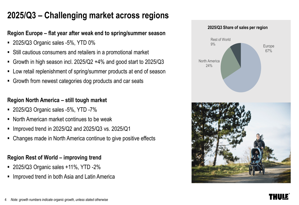 Regional performance varied considerably, with Europe and North America both experiencing 5% organic sales declines in Q3, while the Rest of World region showed strong 11% organic growth. Europe remains Thule’s largest market, accounting for 67% of sales, followed by North America at 24% and Rest of World at 9%.