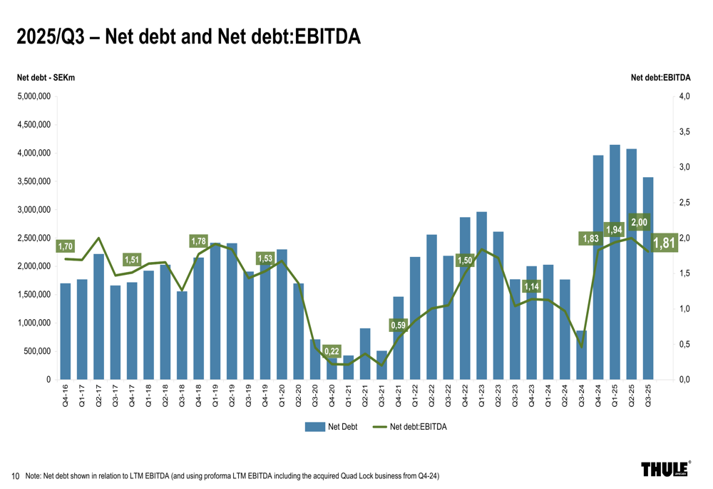 Thule’s financial leverage has improved slightly, with the Net Debt:EBITDA ratio decreasing to 1.81 in Q3 2025 from 2.00 in Q2 2025: