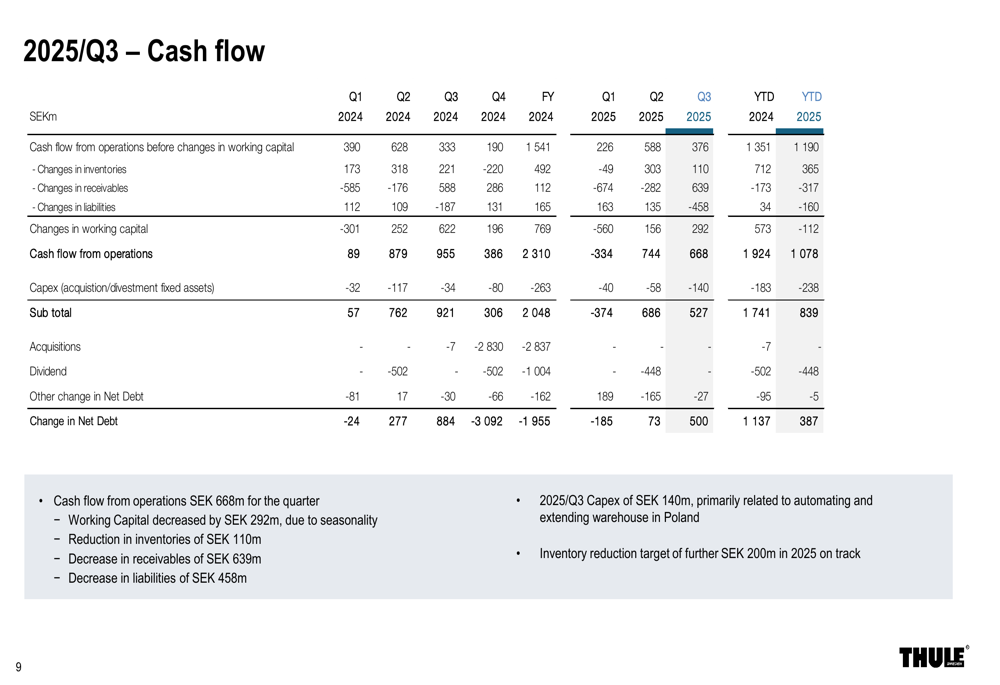 Cash flow from operations reached SEK 668 million for the quarter, with working capital decreasing by SEK 292 million due to seasonality. The company continues to make progress on its inventory reduction target of SEK 200 million for 2025.
