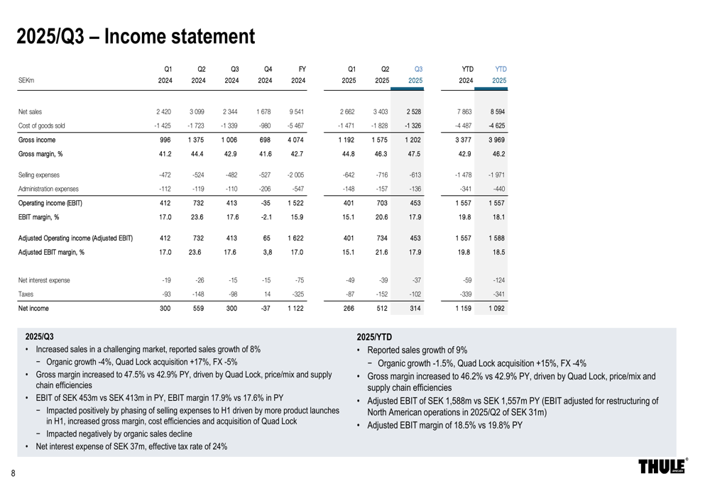 Thule reported Q3 2025 sales of SEK 2,528 million, up from SEK 2,344 million in the same period last year, representing a 7.9% reported growth. While organic growth declined by 4.0%, the acquisition of Quad Lock contributed significantly with a 17% positive impact, partially offset by a 5.1% negative currency effect.