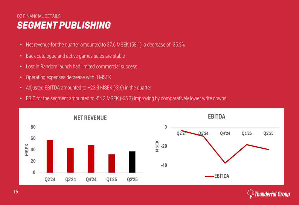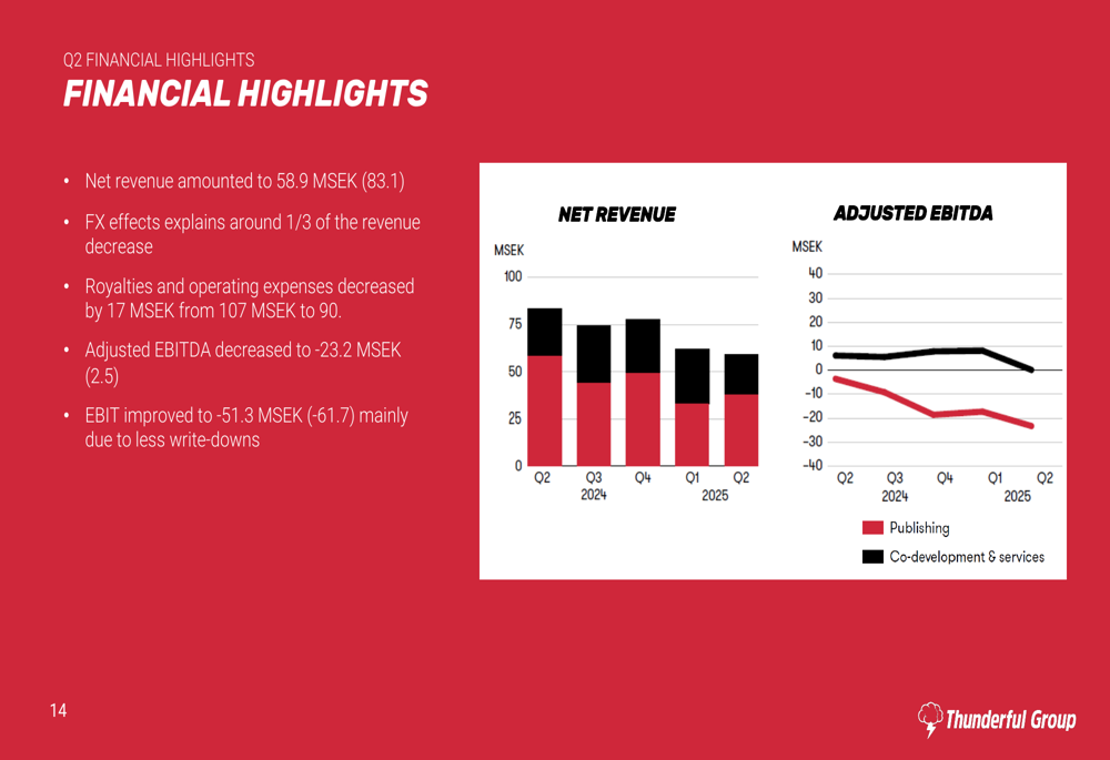 Thunderful reported net revenue of 59 MSEK for Q2 2025, representing a 29% year-over-year decline. The company noted that approximately one-third of this revenue decrease was attributable to foreign exchange effects. Adjusted EBITDA fell to -23.2 MSEK, down from 2.5 MSEK in the same quarter last year.