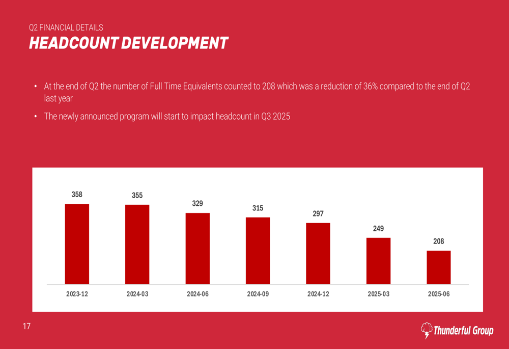 Thunderful has implemented significant workforce reductions as part of its restructuring efforts. By the end of Q2 2025, the company’s headcount stood at 208 full-time equivalents, representing a 36% reduction compared to the same period last year. Management indicated that additional restructuring announced after the quarter’s end will further impact headcount in Q3 2025.
