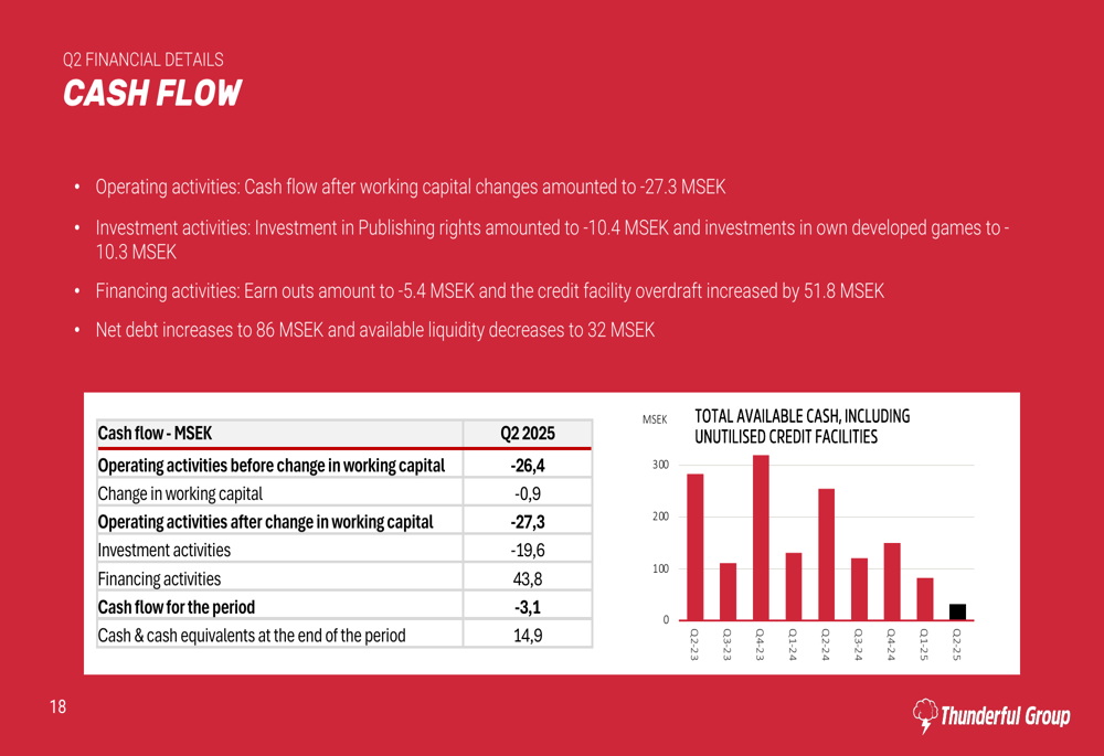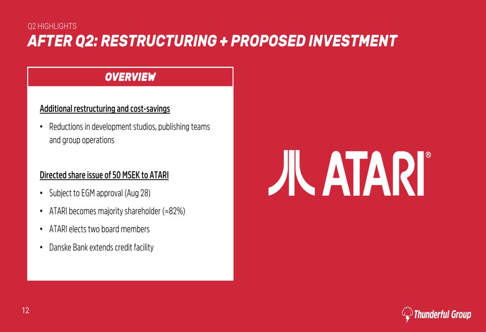 After the quarter’s end, Thunderful announced additional restructuring measures affecting its development studios, publishing teams, and group operations. The company also revealed a proposed directed share issue of 50 MSEK to Atari, which would make Atari the majority shareholder with approximately 82% ownership. The deal includes Atari appointing two board members and Danske Bank extending Thunderful’s credit facility.