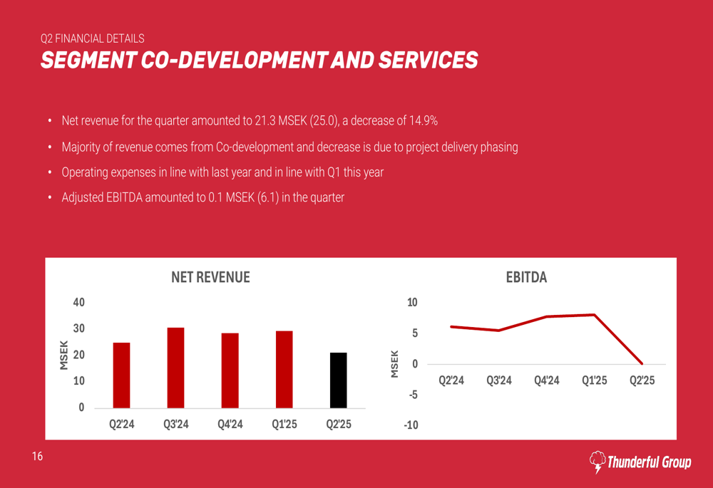 Breaking down performance by segment, Publishing revenue fell 35.2% to 37.6 MSEK, while Co-Development & Services revenue decreased 14.9% to 21.3 MSEK. The Publishing segment reported an adjusted EBITDA of -23.3 MSEK, while Co-Development & Services managed a slightly positive adjusted EBITDA of 0.1 MSEK.