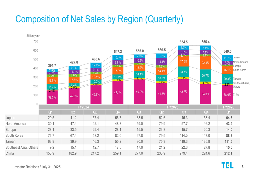 Tokyo Electron’s regional sales composition reveals significant geographic dependencies, with China representing 38.6% of total sales (212.1 billion yen) in Q1 FY2026. This highlights the company’s exposure to the Chinese semiconductor market, which has been affected by both scaling back of legacy investments by emerging Chinese chip manufacturers and export regulations.
