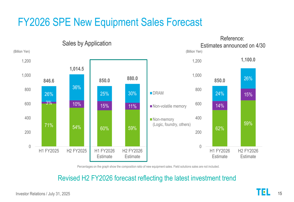 Tokyo Electron expects a shift in product mix in the second half of FY2026, with non-memory applications decreasing from 71% to 59% of SPE new equipment sales, while DRAM increases from 26% to 30% and non-volatile memory from 3% to 11%. This projection suggests an anticipated recovery in memory investments later in the fiscal year.