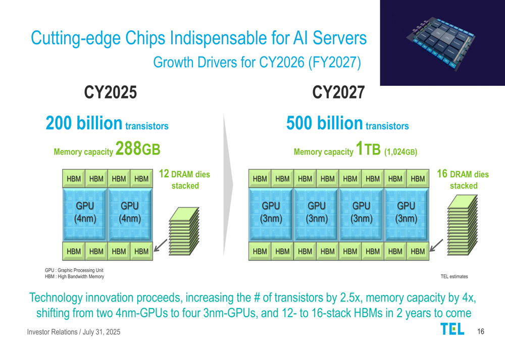 A key driver of future demand is the increasing complexity of cutting-edge chips for AI servers. Tokyo Electron highlighted that from CY2025 to CY2027, AI server chips are expected to increase from 200 billion to 500 billion transistors, with memory capacity growing from 288GB to 1TB, and GPU nodes advancing from two 4nm GPUs to four 3nm GPUs.