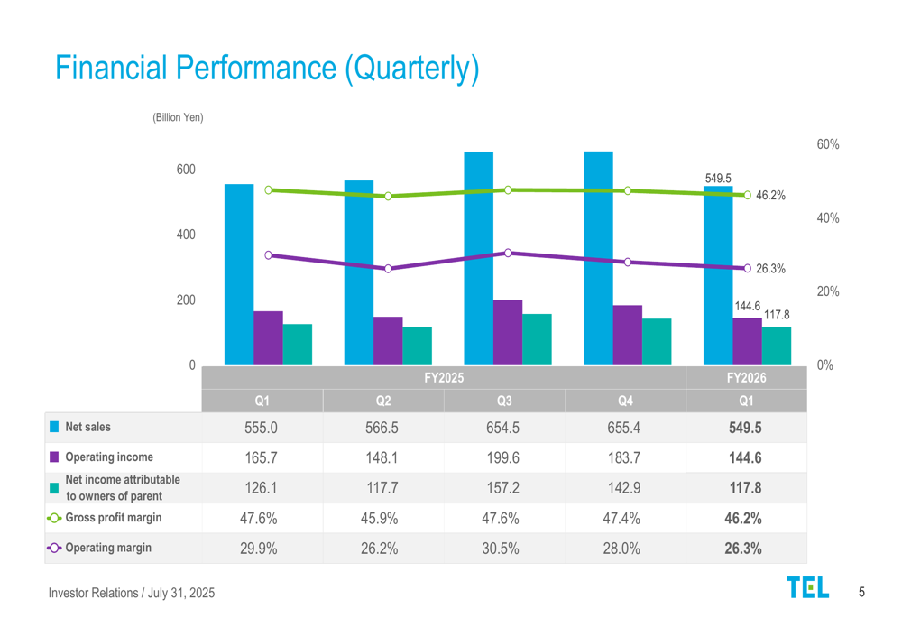 Tokyo Electron reported Q1 FY2026 net sales of 549.5 billion yen, representing a 1.0% year-over-year decrease and a more substantial 16.1% quarter-over-quarter decline. Operating income fell 12.7% year-over-year to 144.6 billion yen, with operating margin contracting to 26.3% from 29.9% in the same period last year.