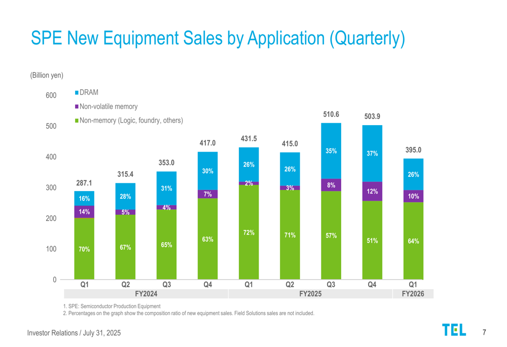 In terms of product mix, non-memory applications (logic, foundry, and others) dominated the company’s Semiconductor Production Equipment (SPE) new equipment sales at 64% in Q1 FY2026, with DRAM accounting for 26% and non-volatile memory for 10%. This reflects the current industry focus on advanced logic for AI and high-performance computing applications.