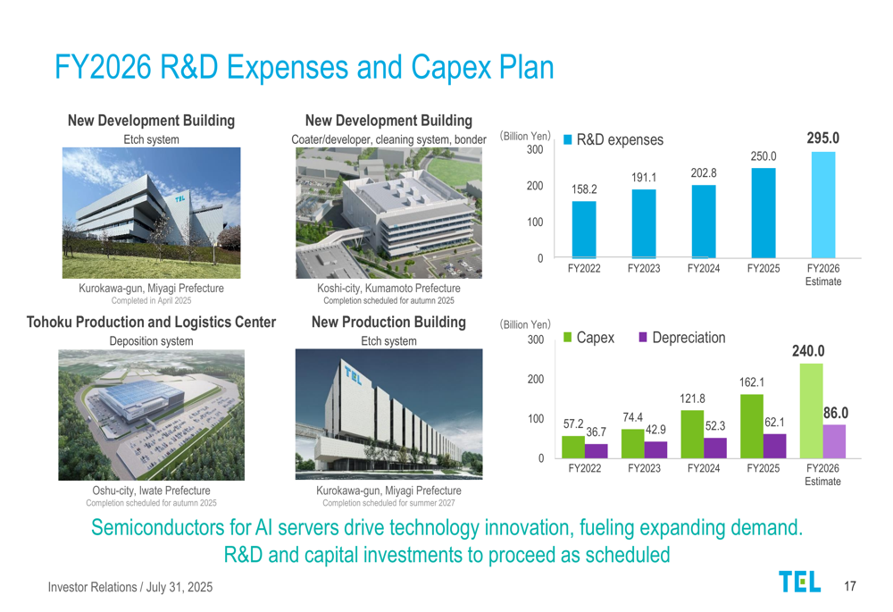 Despite near-term challenges, Tokyo Electron is investing in new facilities to support future growth, including a New Development Building in Kumamoto Prefecture, a Tohoku Production and Logistics Center in Iwate Prefecture, and a New Production Building in Miyagi Prefecture. The company plans R&D expenses of 295 billion yen and capital expenditures of 240 billion yen for FY2026.