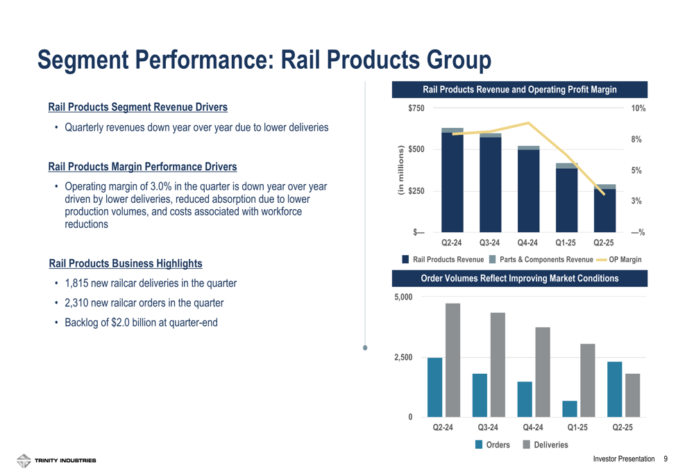 In contrast, the Rail Products Group faced challenges with operating margin declining to 3.0%, driven by lower deliveries, reduced absorption due to lower production volumes, and costs associated with workforce reductions. Despite these challenges, Trinity delivered 1,815 new railcars in the quarter and secured orders for 2,310 units, resulting in a book-to-bill ratio of 1.3x – the first time this metric has exceeded 1.0 in ten quarters.