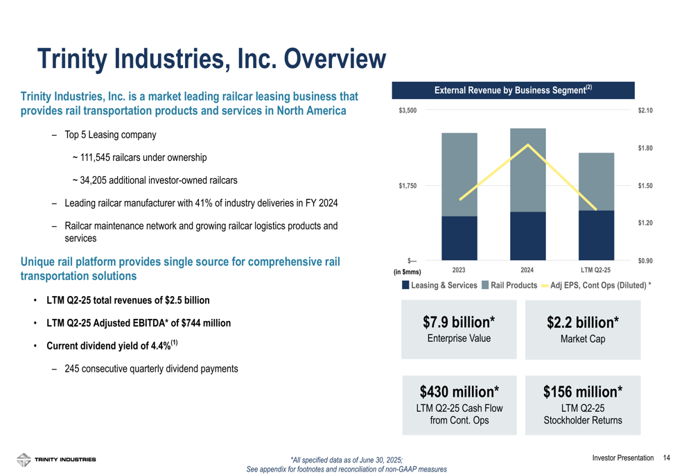Trinity positions itself as a comprehensive rail transportation solutions provider, ranking among the top 5 leasing companies in the industry. The company delivered 41% of industry railcars in FY 2024, demonstrating its significant market position. With an enterprise value of $7.9 billion and market capitalization of $2.2 billion, Trinity continues to deliver shareholder returns, maintaining a 4.4% dividend yield and 245 consecutive quarterly dividend payments.
