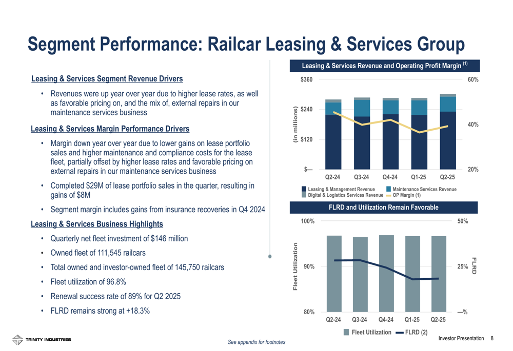 Trinity’s Railcar Leasing & Services Group demonstrated strong performance with fleet utilization of 96.8% and a Future Lease Rate Differential (FLRD) of +18.3%, indicating continued strength in lease rates. The company completed $29 million of lease portfolio sales in the quarter, resulting in gains of $8 million. The owned fleet consists of 111,545 railcars, with an additional 34,205 investor-owned railcars under management.