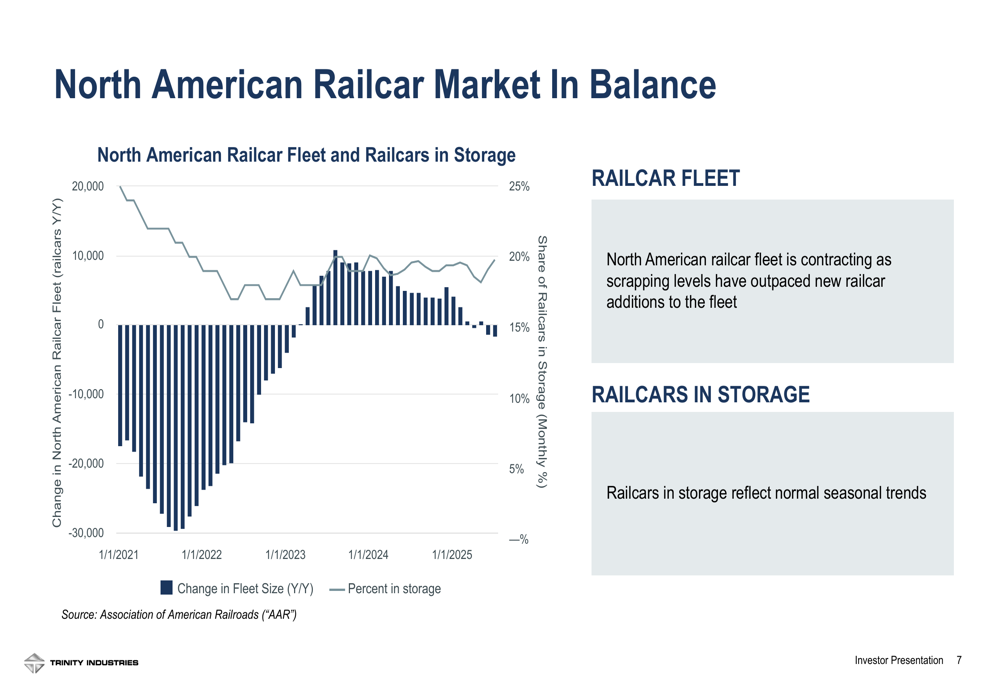 The railcar market appears to be stabilizing, with Trinity noting that the North American railcar fleet is contracting as scrapping levels have outpaced new railcar additions. Railcars in storage reflect normal seasonal trends, suggesting a balanced market environment.