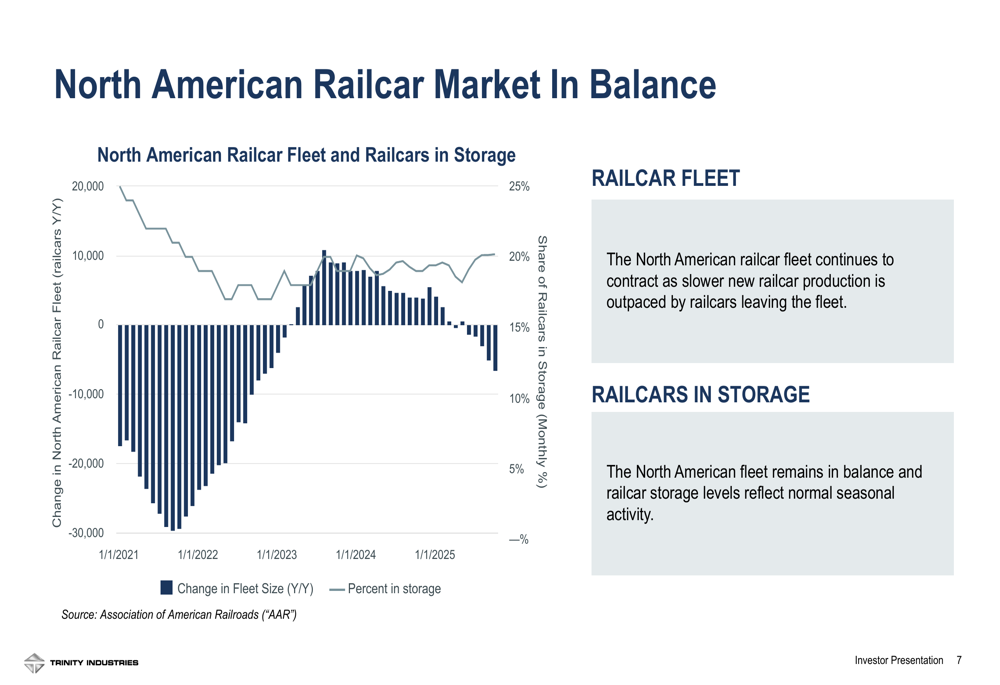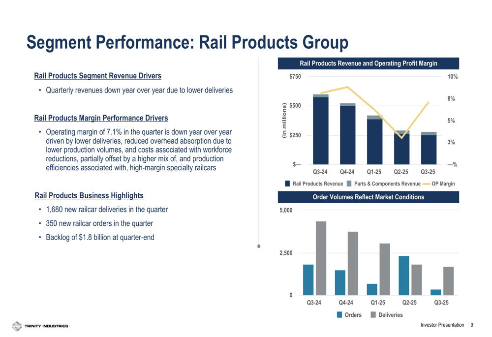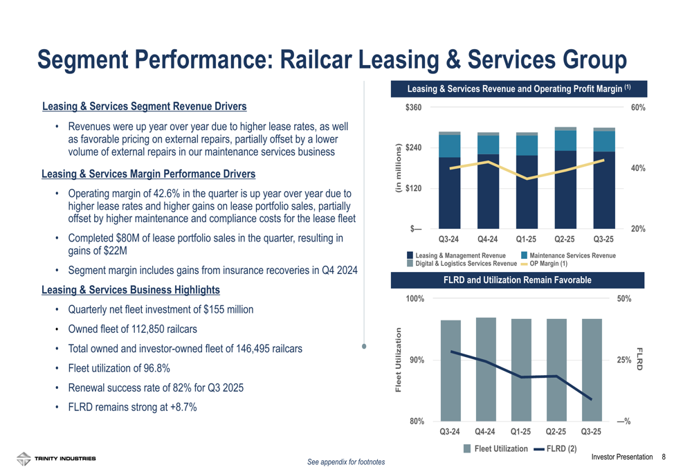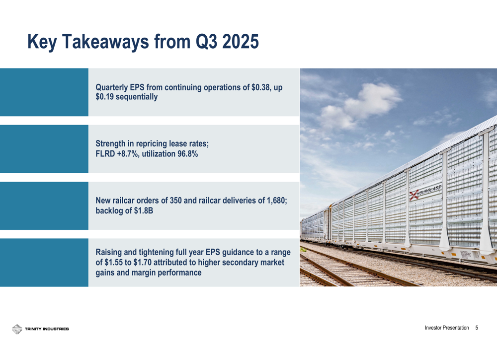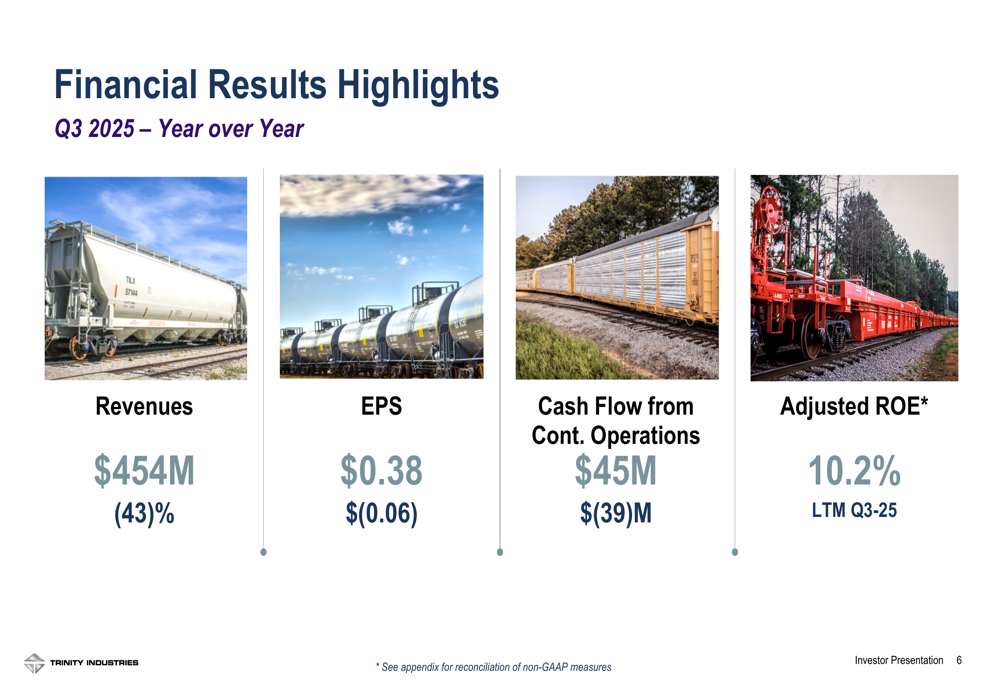 Trinity reported Q3 2025 EPS of $0.38, up $0.19 sequentially, despite revenues declining 43% year-over-year. The company highlighted strong performance in lease rate repricing, with a Fleet Lease Rate Differential (FLRD) of +8.7% and utilization maintaining a robust 96.8%. Cash flow from continuing operations reached $45 million, compared to negative $39 million in the year-ago period.