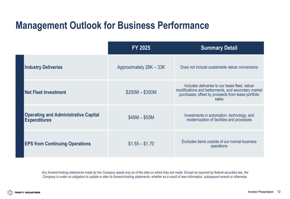 Looking ahead, Trinity forecasts industry deliveries of approximately 28,000-33,000 railcars for fiscal year 2025. The company projects net fleet investment of $250-350 million and operating and administrative capital expenditures of $45-55 million. The raised EPS guidance of $1.55-1.70 excludes items outside normal business operations.