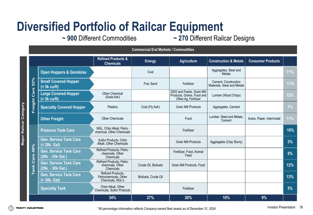 Trinity positions itself as a market leader in the North American rail transportation sector, ranking among the top five leasing companies with 112,850 railcars under ownership and an additional 33,645 investor-owned railcars under management. The company captured 41% of industry deliveries in FY 2024 and maintains a diversified portfolio serving approximately 900 different commodities across various commercial end markets.