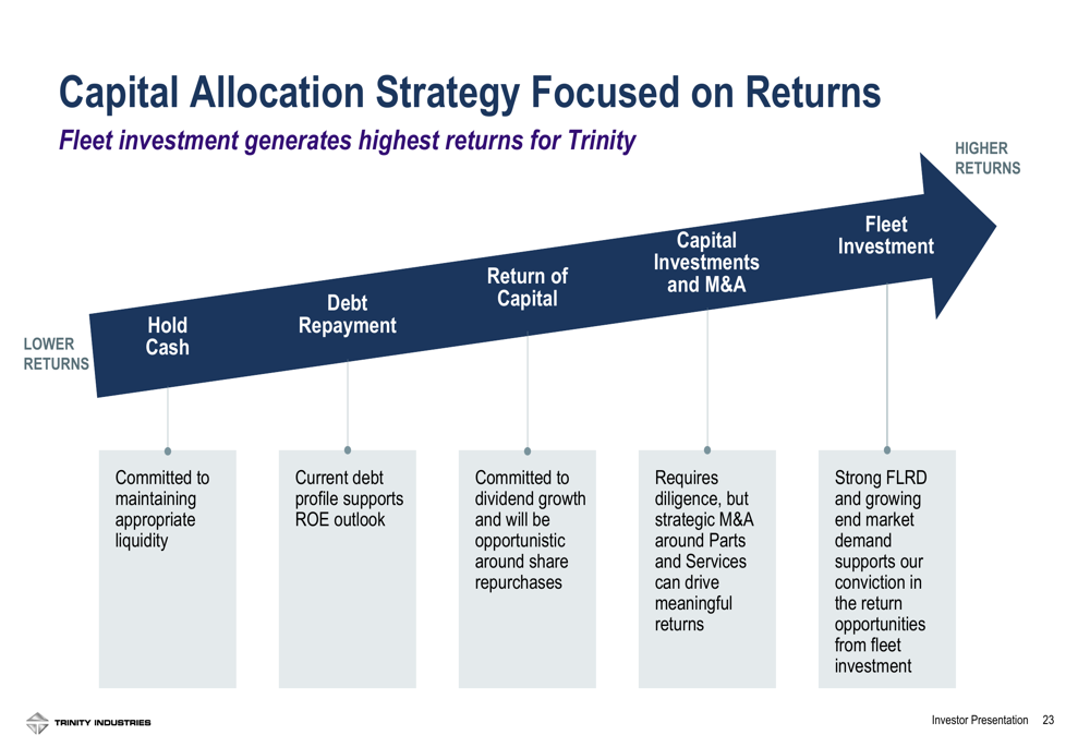 Trinity’s capital allocation strategy prioritizes fleet investment, which the company identifies as generating the highest returns: