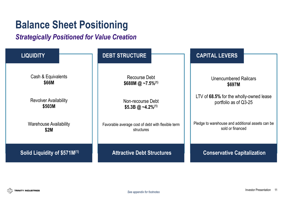 Trinity maintains a solid financial position with total liquidity of $571 million, including $66 million in cash and equivalents and $503 million in revolver availability. The company’s debt structure consists of $688 million in recourse debt at approximately 7.5% interest and $5.3 billion in non-recourse debt at approximately 4.2%.