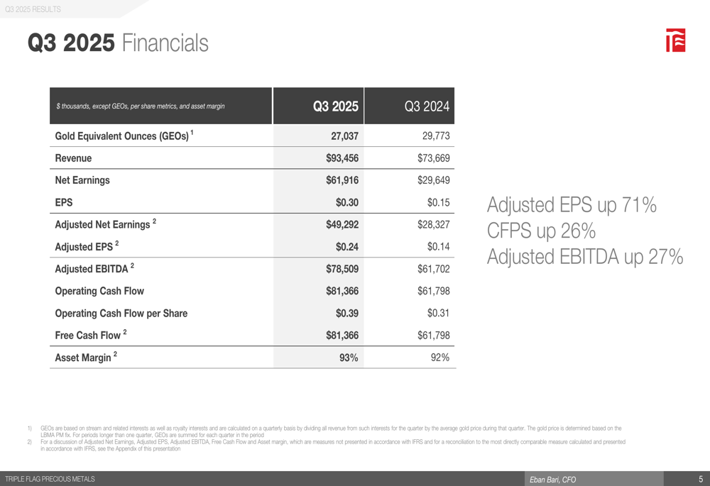 Triple Flag reported 27,037 gold equivalent ounces (GEOs) for Q3 2025, slightly down from 29,773 GEOs in the same period last year. However, the company achieved record financial results, with revenue increasing to $93.46 million from $73.67 million in Q3 2024, driven by higher precious metals prices.