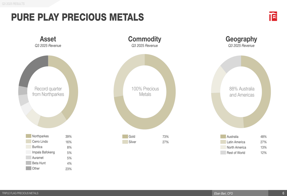 Triple Flag's portfolio remains well-diversified geographically, with 48% of Q3 2025 revenue coming from Australia, 27% from Latin America, 13% from North America, and 12% from the rest of the world. The Northparkes mine delivered a record quarter, contributing 39% of the company's revenue: