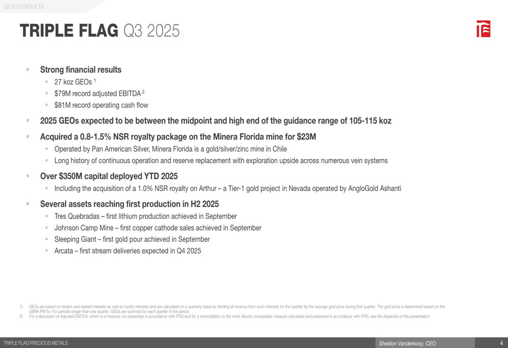 CEO Sheldon Vanderkooy commented during the earnings call, "2025 has been an exceptional year so far, and Triple Flag has achieved another record quarter in Q3," emphasizing the benefits shareholders are receiving from increased production and rising gold prices.