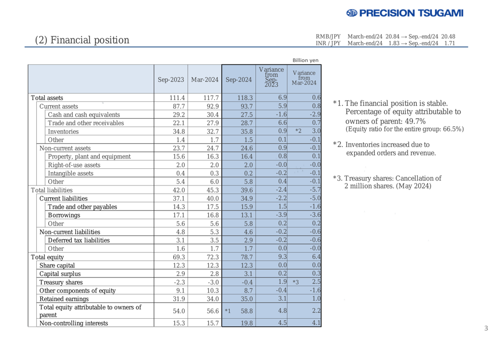 Tsugami’s balance sheet showed continued strengthening, with total assets increasing from 111.4 billion yen in September 2023 to 118.3 billion yen in September 2024. The company’s equity position improved significantly, with total equity rising from 69.3 billion yen to 78.7 billion yen over the same period.
