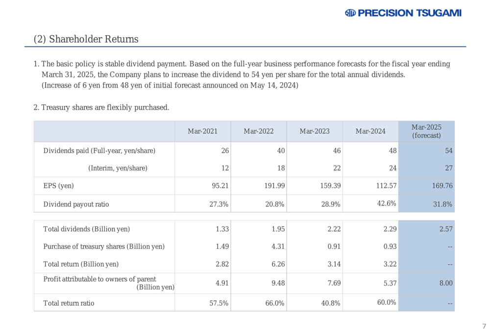 The dividend payout ratio is expected to be 31.8% for FY2025, down from 42.6% in FY2024 but higher than the 20.8% recorded in FY2022. Total dividends are forecast to reach 2.57 billion yen in FY2025.