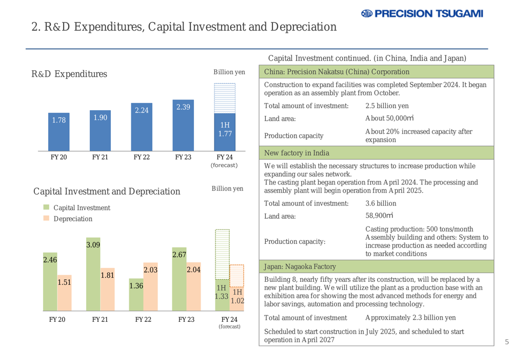 Tsugami is actively investing in capacity expansion and R&D to support future growth. The company’s capital investment and R&D plans highlight its strategic priorities:
