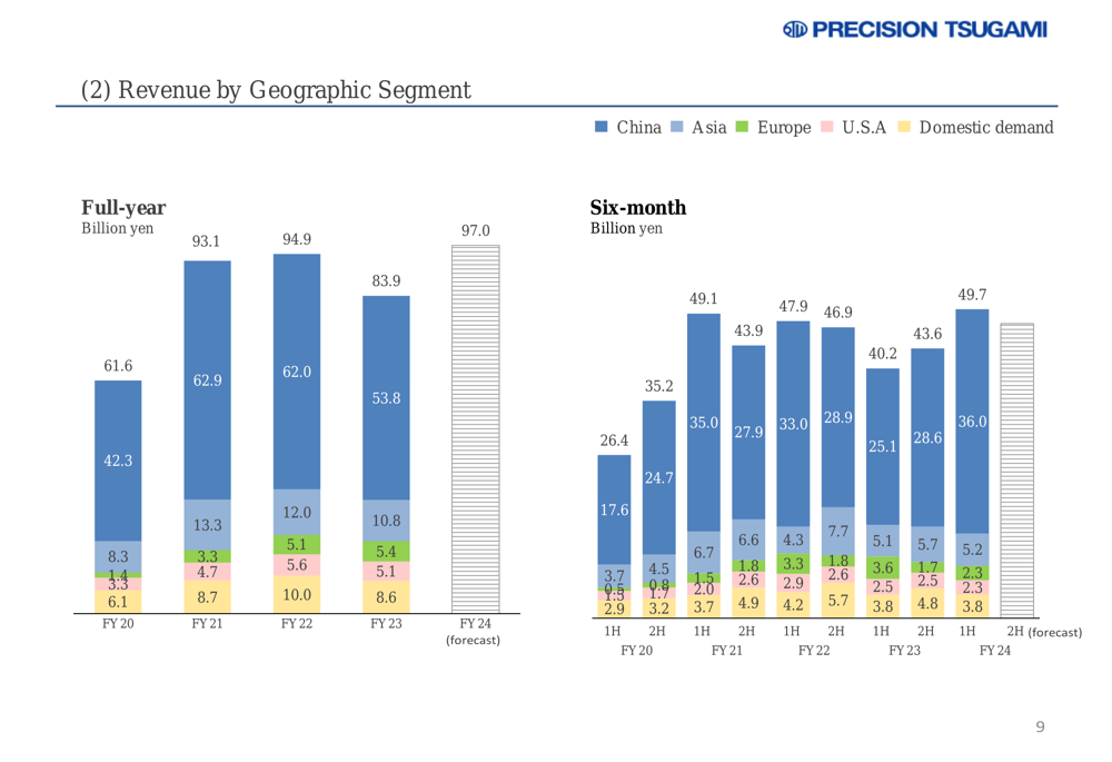 Tsugami’s revenue is diversified across business segments and geographic regions, with China representing the largest market. The company’s revenue by business segment shows the relative contributions of IT, automotive, and other sectors: