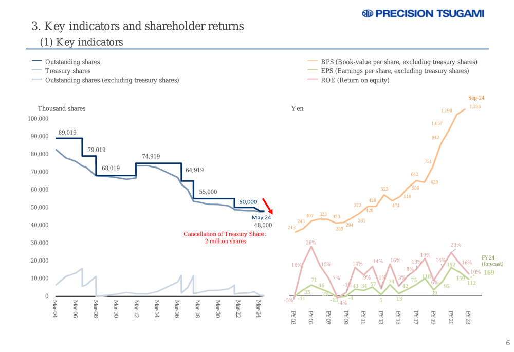 In May 2024, Tsugami also canceled 2 million treasury shares, further enhancing shareholder value. The company’s key indicators show positive trends in book value per share and return on equity: