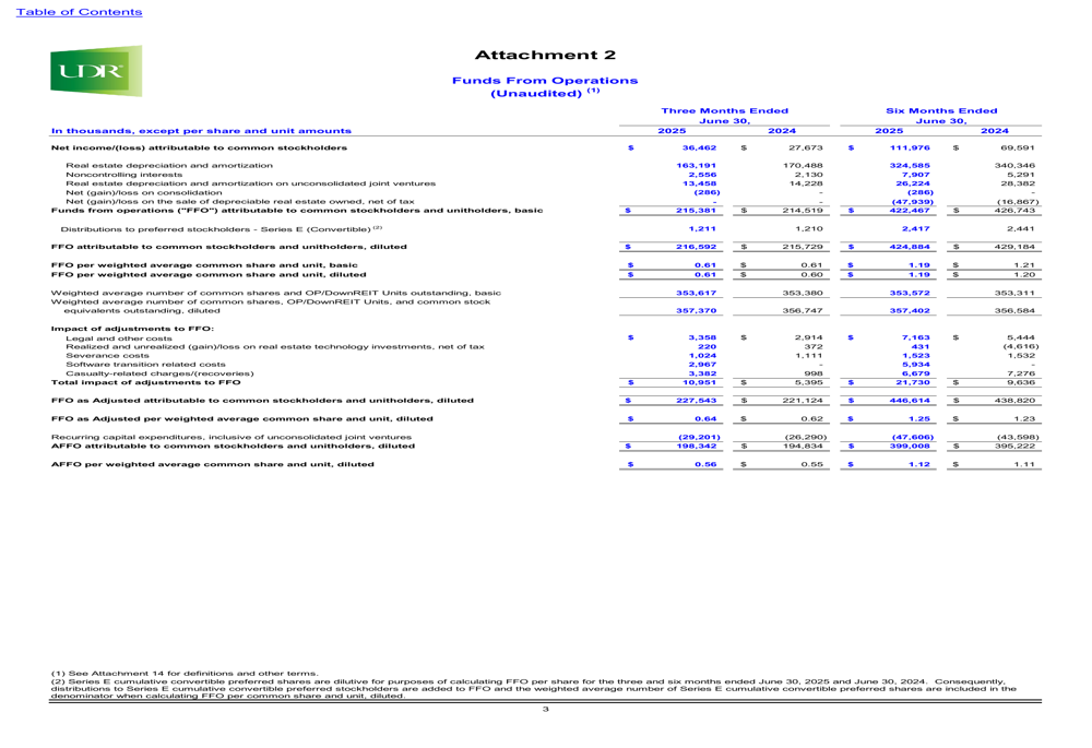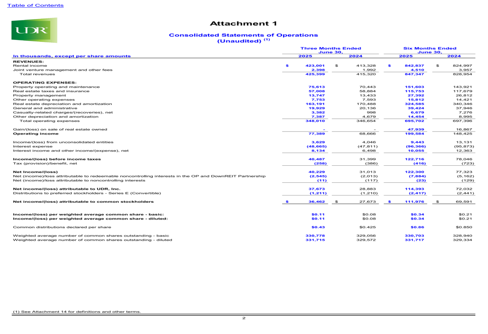 UDR reported net income attributable to common stockholders of $36.5 million, or $0.11 per diluted share for Q2 2025. Total revenue increased by $10.1 million year-over-year, representing a 2.4% gain to $425.4 million.
