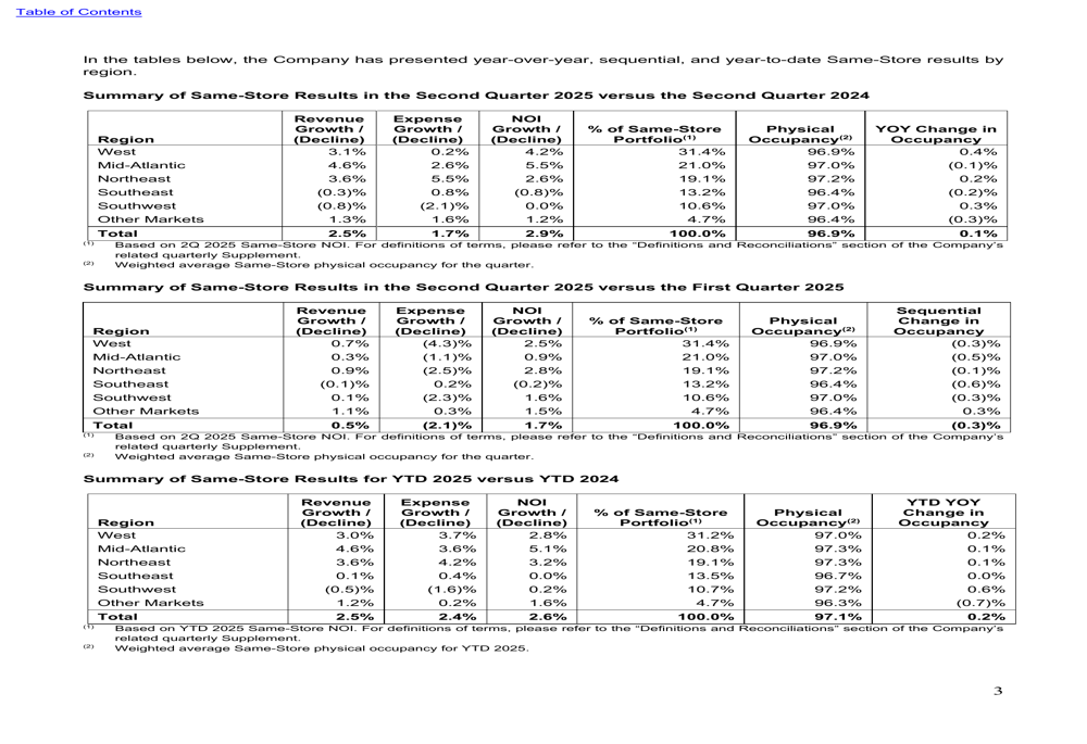 The company’s same-store portfolio, comprising 54,915 apartment homes across 165 communities, demonstrated solid performance with revenue growth of 2.5%, expense growth of 1.7%, and resulting NOI growth of 2.9% compared to Q2 2024. Physical occupancy remained high at 96.9%, a slight improvement of 0.1% year-over-year.