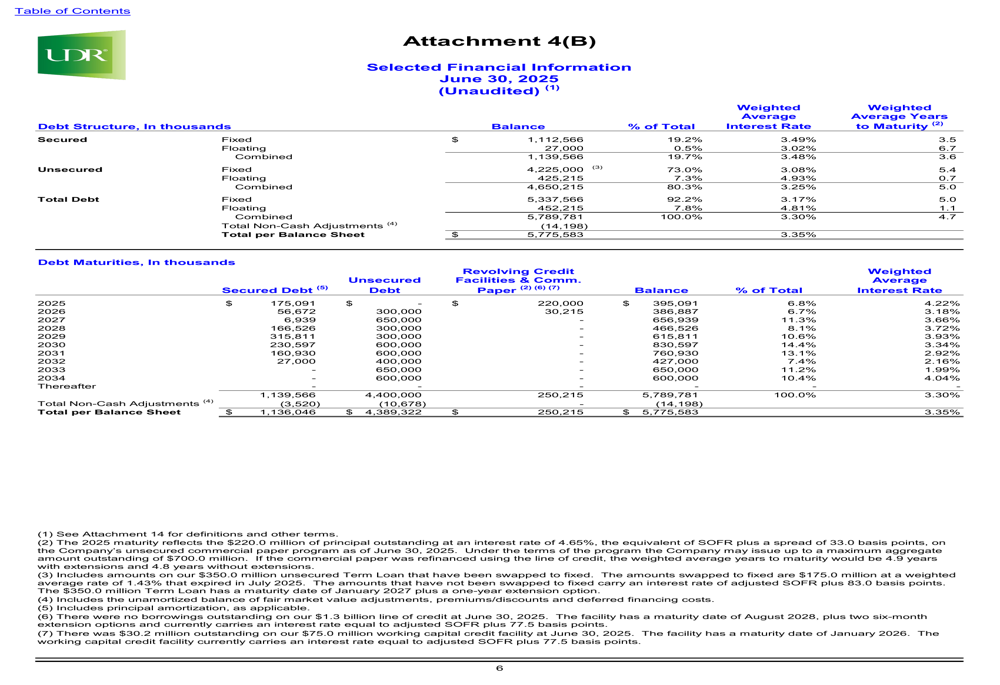 UDR maintained a strong balance sheet with total indebtedness of $5.8 billion as of June 30, 2025. The company reported liquidity of $1.1 billion through cash and undrawn capacity on credit facilities.