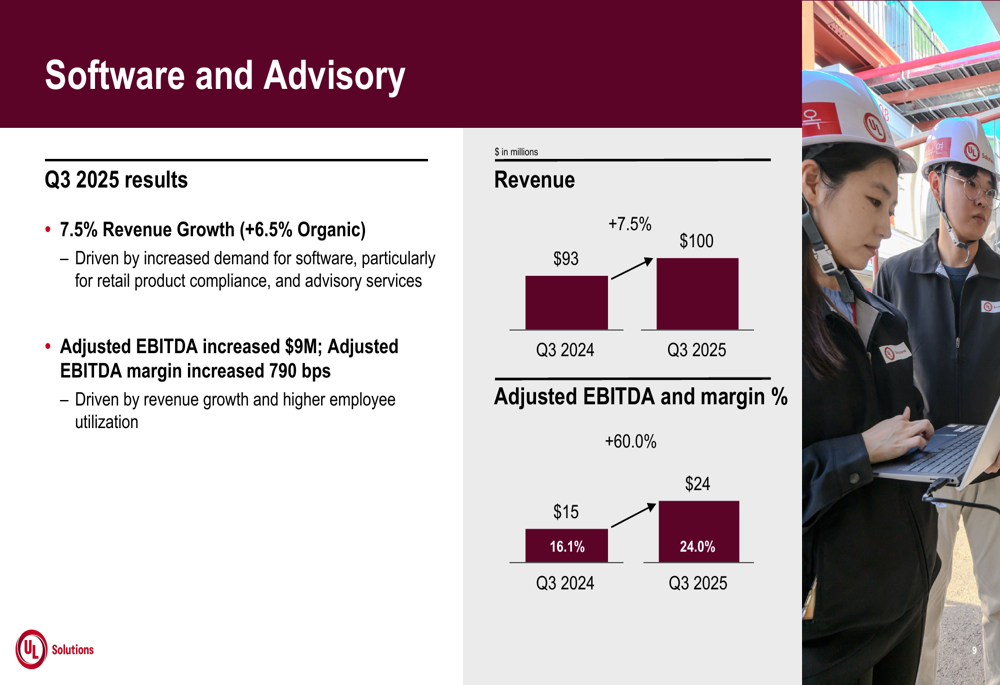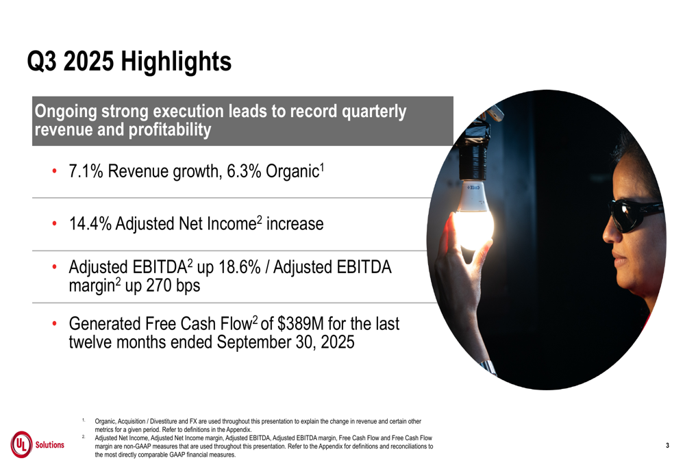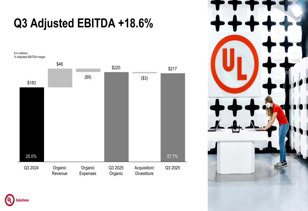 UL Solutions delivered robust financial results for the third quarter, with organic revenue growth of 6.3% and total revenue growth of 7.1% compared to Q3 2024. The company's adjusted EBITDA increased by 18.6% to $217 million, with margin expansion of 270 basis points to 27.7%.