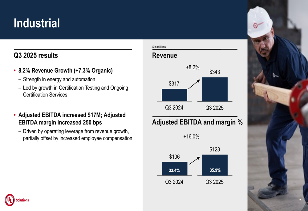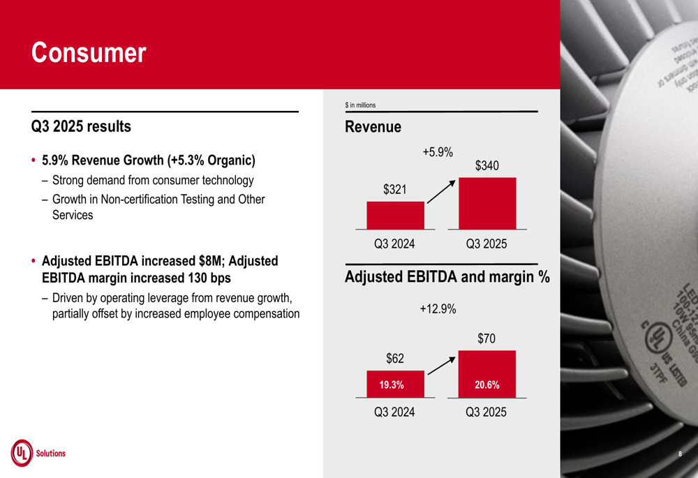 The Consumer segment also delivered solid results, with revenue growth of 5.9% (5.3% organic) to $340 million. This growth was driven by strong demand from consumer technology and growth in Non-certification Testing and Other Services. Adjusted EBITDA for the segment increased by 12.9% to $70 million, with margin expansion of 130 basis points to 20.6%.