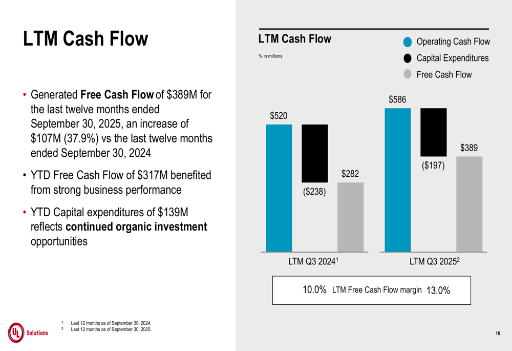UL Solutions generated robust free cash flow of $389 million for the last twelve months ended September 30, 2025, representing a significant increase of 37.9% compared to the same period in 2024. The free cash flow margin improved from 10.0% to 13.0%, reflecting the company's strong operational execution and disciplined capital management.