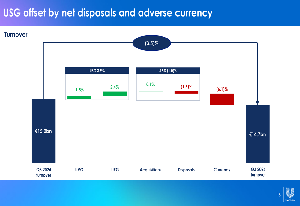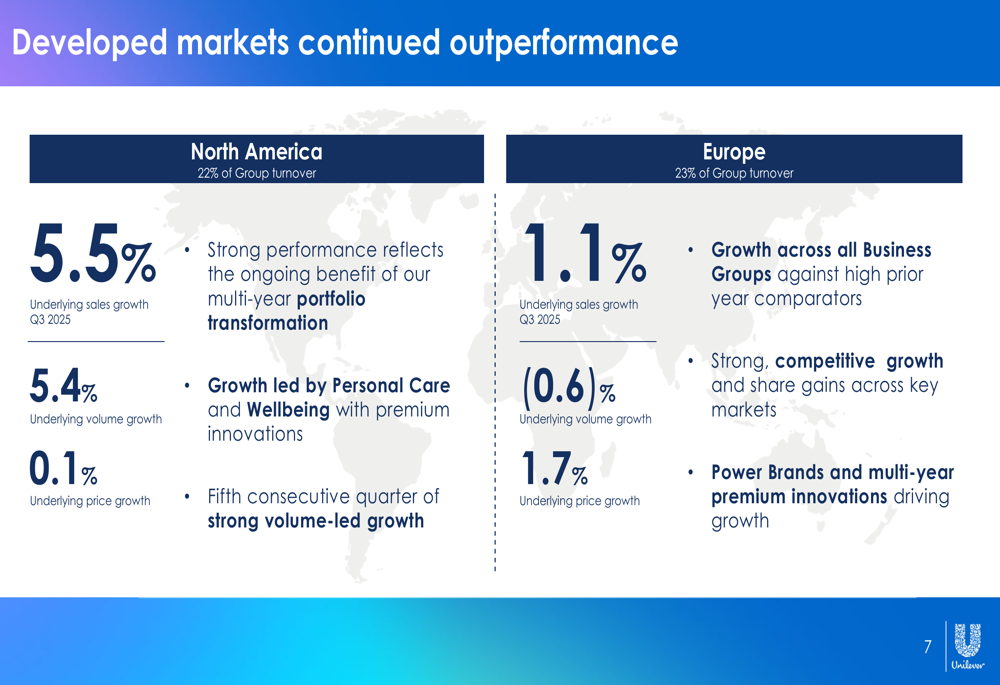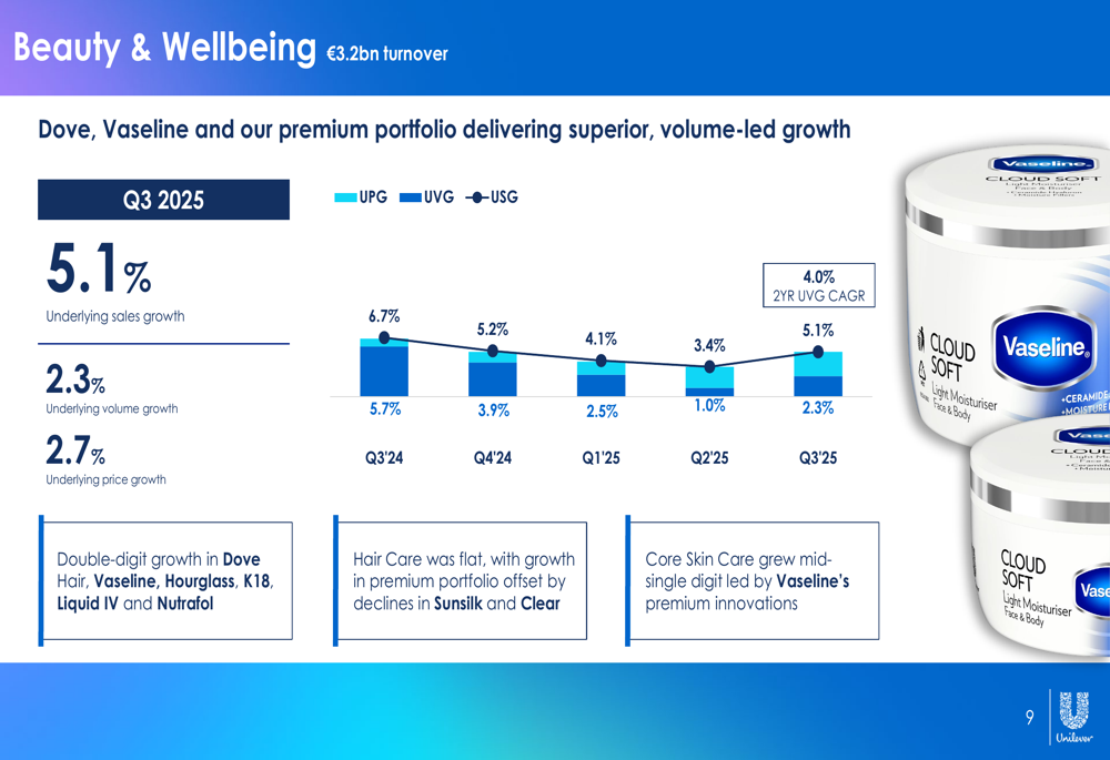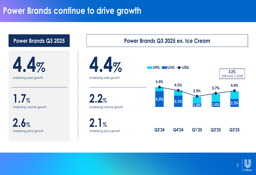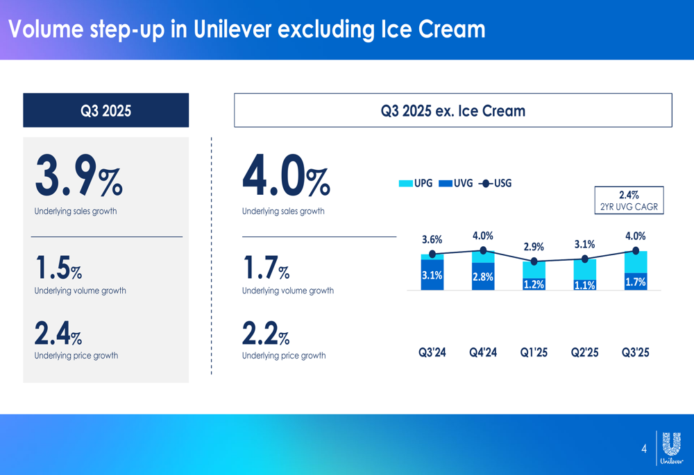 Unilever’s Q3 2025 results showed encouraging signs of volume acceleration, particularly when excluding the Ice Cream business. Underlying volume growth excluding Ice Cream reached 1.7%, with underlying sales growth of 4.0%.