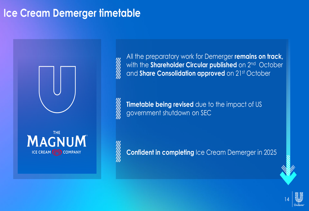 Unilever provided an update on its Ice Cream demerger, which remains on track despite some timeline adjustments due to the impact of the US government shutdown on SEC processes. The company published its Shareholder Circular on October 2, 2025, and received approval for the Share Consolidation on October 21, 2025.