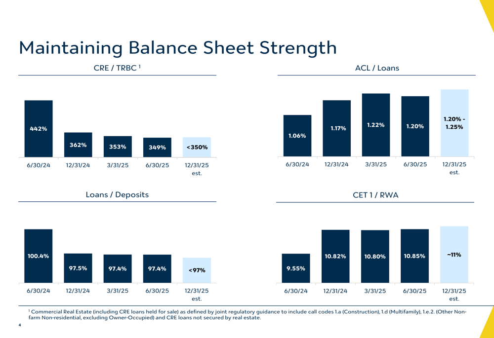 Valley’s balance sheet metrics also showed notable strengthening, with the CET1/RWA ratio improving to 10.85% from 9.55% a year ago, and the loans-to-deposits ratio improving to 97.4% from 100.4% in Q2 2024. The allowance for credit losses (ACL) to loans ratio increased to 1.20% from 1.06% a year earlier, reflecting a prudent approach to potential credit risks.